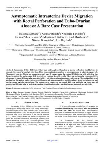 Sarhane, Hassnaa and Bahida, Kaoutar and Yartaouii, Nouhaila and Zahra Belouaza, Fatima and Balouch, Mouhamed and Mouhamed, Kaid and Benouicha, Nisrine and Baydada, Aziz (2025) Asymptomatic Intrauterine Device Migration with Rectal Perforation and Tubo-Ovarian Abscess: A Rare Case Presentation. International Journal of Innovative Science and Research Technology, 10 (8): 25aug301. pp. 360-363. ISSN 2456-2165