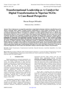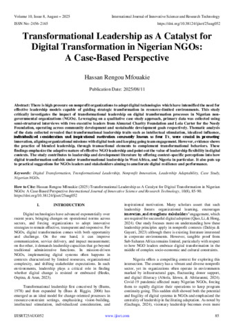 Rengou Mfouakie, Hassan (2025) Transformational Leadership as A Catalyst for Digital Transformation in Nigerian NGOs: A Case-Based Perspective. International Journal of Innovative Science and Research Technology, 10 (8): 25aug052. pp. 85-90. ISSN 2456-2165