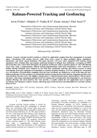 P John, Jovin and A, Abhijith and K N, Nadha and Antony, Denin and Ansel V, Paul (2025) Kalman-Powered Tracking and Geofencing. International Journal of Innovative Science and Research Technology, 10 (8): 25aug123. pp. 98-102. ISSN 2456-2165