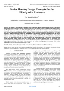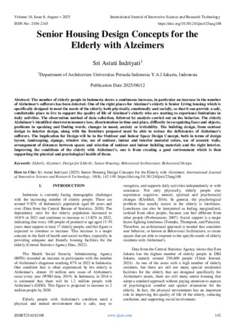 Indriyati, Sri Astuti (2025) Senior Housing Design Concepts for the Elderly with Alzeimers. International Journal of Innovative Science and Research Technology, 10 (8): 25aug108. pp. 142-149. ISSN 2456-2165