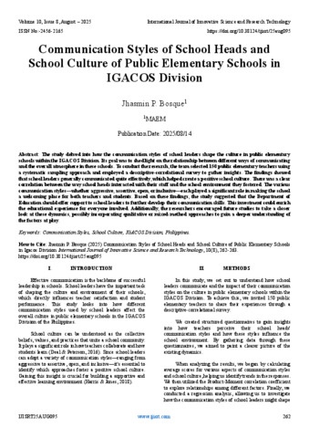 P. Bosque, Jhasmin (2025) Communication Styles of School Heads and School Culture of Public Elementary Schools in IGACOS Division. International Journal of Innovative Science and Research Technology, 10 (8): 25aug095. pp. 262-263. ISSN 2456-2165