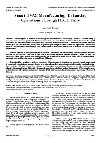 Mavi, Aakarsh (2025) Smart HVAC Manufacturing: Enhancing Operations Through IT/OT Unity. International Journal of Innovative Science and Research Technology, 10 (7): 25jul1859. pp. 3576-3582. ISSN 2456-2165