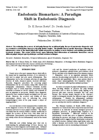 Shetty, K Shreya and Amin, Swathi (2025) Endodontic Biomarkers: A Paradigm Shift in Endodontic Diagnosis. International Journal of Innovative Science and Research Technology, 10 (7): 25jul1894. pp. 3588-3594. ISSN 2456-2165