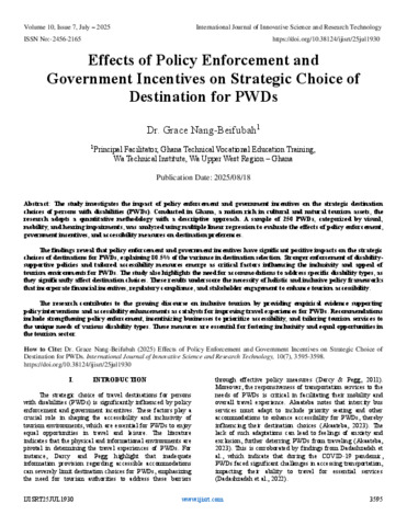 Nang-Beifubah, Dr. Grace (2025) Effects of Policy Enforcement and Government Incentives on Strategic Choice of Destination for PWDs. International Journal of Innovative Science and Research Technology, 10 (7): 25jul1930. pp. 3595-3598. ISSN 2456-2165