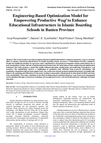 Furqonuddin, Asep and ., Zakaria and Syarifuddin, E. and Firdaos, Rijal and Muslihah, Eneng (2025) Engineering-Based Optimization Model for Empowering Productive Waqf to Enhance Educational Infrastructure in Islamic Boarding Schools in Banten Province. International Journal of Innovative Science and Research Technology, 10 (7): 25jul1426. pp. 3612-3619. ISSN 2456-2165
