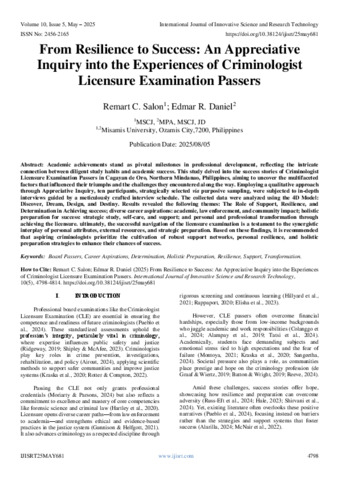 C. Salon, Remart and R. Daniel, Edmar (2025) From Resilience to Success: An Appreciative Inquiry into the Experiences of Criminologist Licensure Examination Passers. International Journal of Innovative Science and Research Technology, 10 (5): 25MAY681. pp. 4798-4814. ISSN 2456-2165