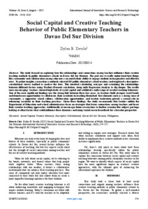 B. Devila, Dylen (2025) Social Capital and Creative Teaching Behavior of Public Elementary Teachers in Davao Del Sur Division. International Journal of Innovative Science and Research Technology, 10 (8): 25aug101. pp. 274-275. ISSN 2456-2165