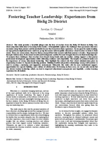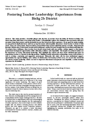 O. Obenza, Juvelyn (2025) Fostering Teacher Leadership: Experiences from Bislig 2b District. International Journal of Innovative Science and Research Technology, 10 (8): 25aug105. pp. 280-281. ISSN 2456-2165