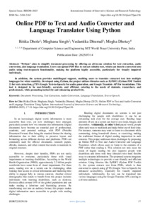 Dhole, Ritika and Singh, Meghana and Dhumal, Vedantika and Dhotay, Megha (2025) Online PDF to Text and Audio Converter and Language Translator Using Python. International Journal of Innovative Science and Research Technology, 10 (6): 25jun156. pp. 17-24. ISSN 2456-2165