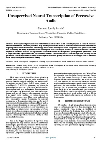 Pasula, Revanth Reddy (2025) Unsupervised Neural Transcription of Percussive Audio. International Journal of Innovative Science and Research Technology, 10 (6): 25jun168. pp. 79-86. ISSN 2456-2165