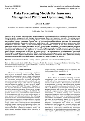 Kande, Jayanth (2025) Data Forecasting Models for Insurance Management Platforms Optimizing Policy. International Journal of Innovative Science and Research Technology, 10 (6): 25jun177. pp. 97-100. ISSN 2456-2165