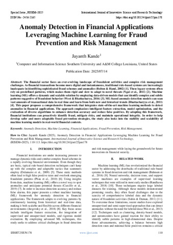 Kande, Jayanth (2025) Anomaly Detection in Financial Applications Leveraging Machine Learning for Fraud Prevention and Risk Management. International Journal of Innovative Science and Research Technology, 10 (6): 25jun178. pp. 110-113. ISSN 2456-2165