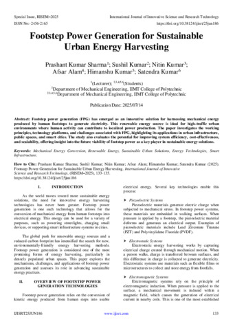 Sharma, Prashant Kumar and Kumar, Sushil and Kumar, Nitin and Alam, Afsar and Kumar, Himanshu and Kumar, Satendra (2025) Footstep Power Generation for Sustainable Urban Energy Harvesting. International Journal of Innovative Science and Research Technology, 10 (6): 25jun186. pp. 133-135. ISSN 2456-2165