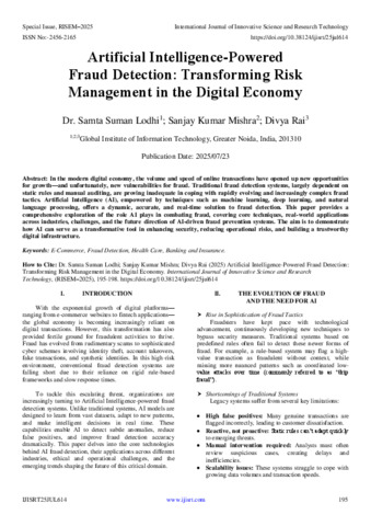 Lodhi, Samta Suman and Mishra, Sanjay Kumar and Rai, Divya (2025) Artificial Intelligence-Powered Fraud Detection: Transforming Risk Management in the Digital Economy. International Journal of Innovative Science and Research Technology, 10 (6): 25jul614. pp. 195-198. ISSN 2456-2165
