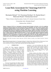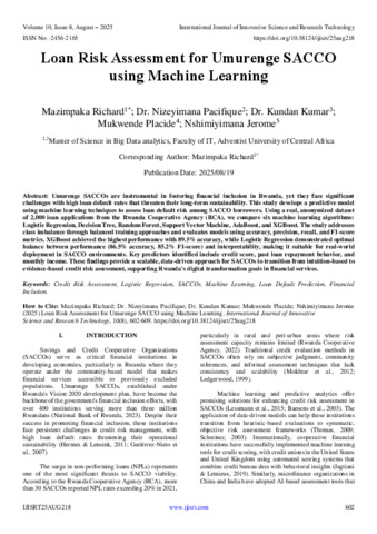 Richard, Mazimpaka and Pacifique, Nizeyimana and Kumar, Kundan and Placide, Mukwende and Jerome, Nshimiyimana (2025) Loan Risk Assessment for Umurenge SACCO using Machine Learning. International Journal of Innovative Science and Research Technology, 10 (8): 25aug218. pp. 602-609. ISSN 2456-2165
