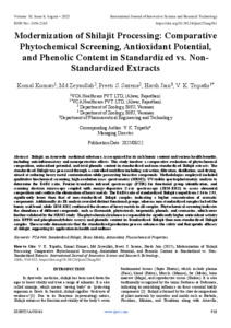 Kumari, Komal and Zeyaullah, Md and S. Saxena, Preeti and Jain, Harsh and Tripathi, V. K. (2025) Modernization of Shilajit Processing: Comparative Phytochemical Screening, Antioxidant Potential, and Phenolic Content in Standardized vs. Non- Standardized Extracts. International Journal of Innovative Science and Research Technology, 10 (8): 25aug561. pp. 910-923. ISSN 2456-2165