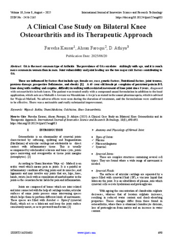 Kausar, Fareeha and Faroqui, Ahsan and Athiya, D. (2025) A Clinical Case Study on Bilateral Knee Osteoarthritis and its Therapeutic Approach. International Journal of Innovative Science and Research Technology, 10 (8): 25aug683. pp. 690-693. ISSN 2456-2165