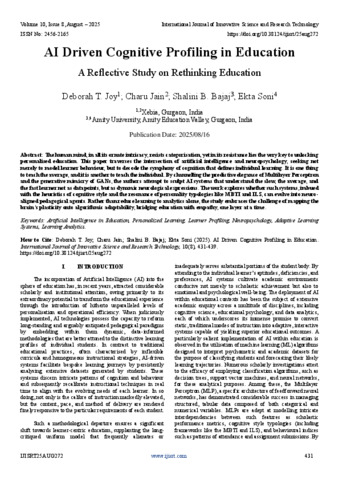 T. Joy, Deborah and Jain, Charu and B. Bajaj, Shalini and Soni, Ekta (2025) AI Driven Cognitive Profiling in Education. International Journal of Innovative Science and Research Technology, 10 (8): 25aug272. pp. 431-439. ISSN 2456-2165