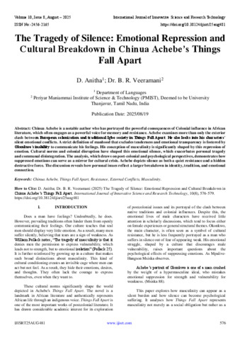 Anitha, D. and Veeramani, Dr. B. R. (2025) The Tragedy of Silence: Emotional Repression and Cultural Breakdown in Chinua Achebe’s Things Fall Apart. International Journal of Innovative Science and Research Technology, 10 (8): 25aug481. pp. 576-579. ISSN 2456-2165