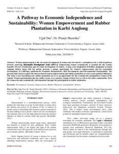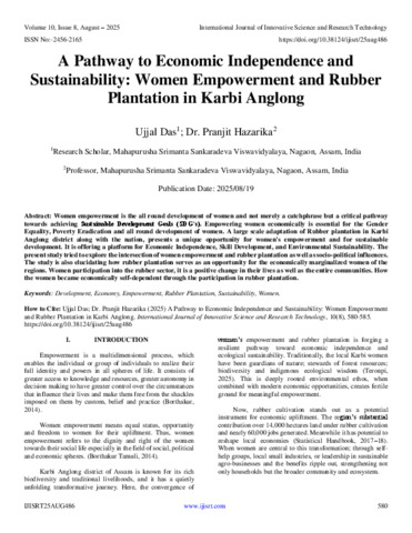 Das, Ujjal and Hazarika, Pranjit (2025) A Pathway to Economic Independence and Sustainability: Women Empowerment and Rubber Plantation in Karbi Anglong. International Journal of Innovative Science and Research Technology, 10 (8): 25aug486. pp. 580-585. ISSN 2456-2165
