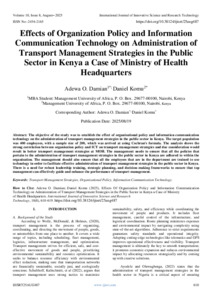 O. Damian, Adewa and Komu, Daniel (2025) Effects of Organization Policy and Information Communication Technology on Administration of Transport Management Strategies in the Public Sector in Kenya a Case of Ministry of Health Headquarters. International Journal of Innovative Science and Research Technology, 10 (8): 25aug487. pp. 610-619. ISSN 2456-2165
