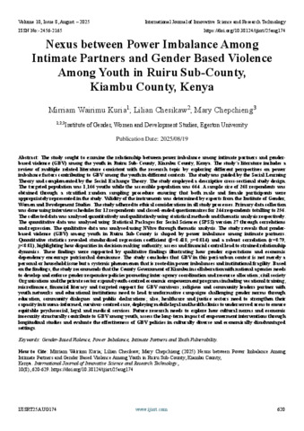 Wairimu Kuria, Mirriam and Chesikaw, Lilian and Chepchieng, Mary (2025) Nexus between Power Imbalance Among Intimate Partners and Gender Based Violence Among Youth in Ruiru Sub-County, Kiambu County, Kenya. International Journal of Innovative Science and Research Technology, 10 (8): 25aug174. pp. 620-629. ISSN 2456-2165