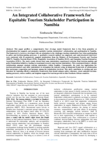 Murima, Simbarashe (2025) An Integrated Collaborative Framework for Equitable Tourism Stakeholder Participation in Namibia. International Journal of Innovative Science and Research Technology, 10 (8): 25aug470. pp. 630-637. ISSN 2456-2165
