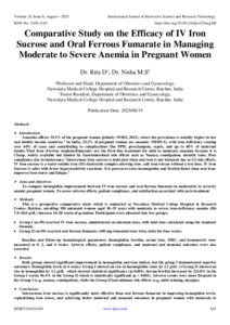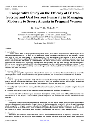 D, Dr. Rita and M.S, Dr. Nisha (2025) Comparative Study on the Efficacy of IV Iron Sucrose and Oral Ferrous Fumarate in Managing Moderate to Severe Anemia in Pregnant Women. International Journal of Innovative Science and Research Technology, 10 (8): 25aug450. pp. 645-650. ISSN 2456-2165