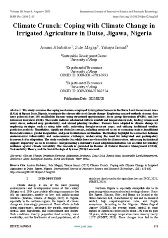 Abubakar, Aminu and Magaji, Sule and Ismail, Yahaya (2025) Climate Crunch: Coping with Climate Change in Irrigated Agriculture in Dutse, Jigawa, Nigeria. International Journal of Innovative Science and Research Technology, 10 (8): 25aug263. pp. 651-660. ISSN 2456-2165