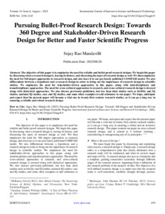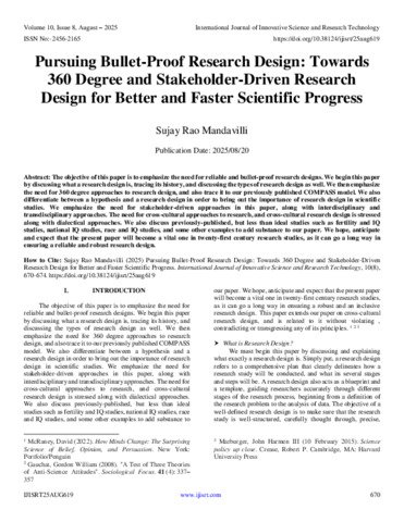 Rao Mandavilli, Sujay (2025) Pursuing Bullet-Proof Research Design: Towards 360 Degree and Stakeholder-Driven Research Design for Better and Faster Scientific Progress. International Journal of Innovative Science and Research Technology, 10 (8): 25aug619. pp. 670-674. ISSN 2456-2165