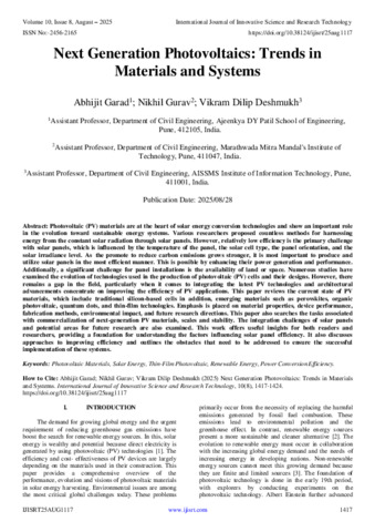 Garad, Abhijit and Gurav, Nikhil and Dilip Deshmukh, Vikram (2025) Next Generation Photovoltaics: Trends in Materials and Systems. International Journal of Innovative Science and Research Technology, 10 (8): 25aug1117. pp. 1417-1424. ISSN 2456-2165