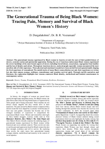 Durgalakshmi, D. and Veeramani, B. R. (2025) The Generational Trauma of Being Black Women: Tracing Pain, Memory and Survival of Black Women’s History. International Journal of Innovative Science and Research Technology, 10 (8): 25aug605. pp. 727-729. ISSN 2456-2165