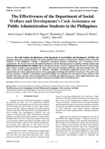 Cuares, Alvin and D. Ilogon, Rolina Fe and T. Sabanal, Flordeliza and D. Prieto, Sheena and L. Quevido, Leah (2025) The Effectiveness of the Department of Social Welfare and Development’s Cash Assistance on Public Administration Students in the Philippines. International Journal of Innovative Science and Research Technology, 10 (8): 25aug467. pp. 730-737. ISSN 2456-2165