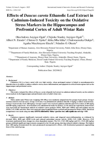 Anyigor-Ogah, Okechukwu and Anyigor-Ogah, Chijioke Stanley and N. Eteudo, Albert and O. Njoku, Clinton and Mba Idika, Idika and Otakpo, Chukwuemeka and Nkechinyere Ekechi, Agatha and O. Okezie, Ndudim (2025) Effects of Daucus carota Ethanolic Leaf Extract in Cadmium-Induced Toxicity on the Oxidative Stress Markers in the Hippocampus and Prefrontal Cortex of Adult Wistar Rats. International Journal of Innovative Science and Research Technology, 10 (8): 25aug264. pp. 850-858. ISSN 2456-2165