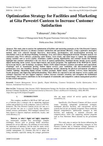 ., Yulinawati and Suyono, Joko (2025) Optimization Strategy for Facilities and Marketing at Gita Pawestri Canteen to Increase Customer Satisfaction. International Journal of Innovative Science and Research Technology, 10 (8): 25aug609. pp. 884-893. ISSN 2456-2165
