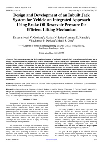 V. Gophane, Dnyaneshwari and N. Lokare, Akshay and D. Kamble, Anand and P. Devkate, Vijaykumar and S. Gore, Mauli (2025) Design and Development of an Inbuilt Jack System for Vehicle an Integrated Approach Using Brake Oil Reservoir Pressure for Efficient Lifting Mechanism. International Journal of Innovative Science and Research Technology, 10 (8): 25aug292. pp. 927-930. ISSN 2456-2165