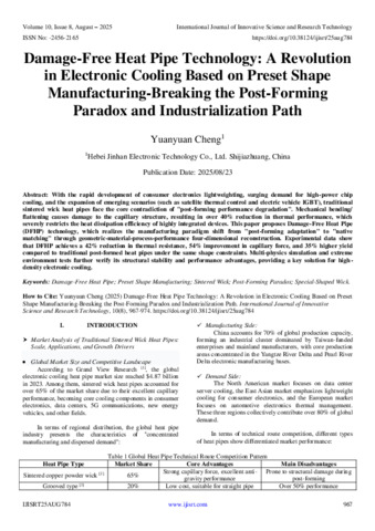 Cheng, Yuanyuan (2025) Damage-Free Heat Pipe Technology: A Revolution in Electronic Cooling Based on Preset Shape Manufacturing-Breaking the Post-Forming Paradox and Industrialization Path. International Journal of Innovative Science and Research Technology, 10 (8): 25aug784. pp. 967-974. ISSN 2456-2165