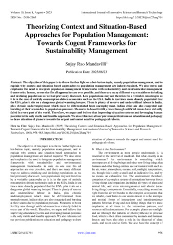 Rao Mandavilli, Sujay (2025) Theorizing Context and Situation-Based Approaches for Population Management: Towards Cogent Frameworks for Sustainability Management. International Journal of Innovative Science and Research Technology, 10 (8): 25aug764. pp. 978-983. ISSN 2456-2165
