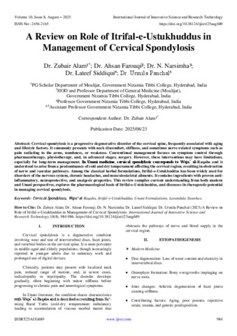 Alam, Dr. Zubair and Farouqi, Dr. Ahsan and Narsimha, Dr. N. and Siddiqui, Dr. Lateef and Panchal, Dr. Urmila (2025) A Review on Role of Itrifal-e-Ustukhuddus in Management of Cervical Spondylosis. International Journal of Innovative Science and Research Technology, 10 (8): 25aug689. pp. 984-986. ISSN 2456-2165