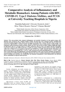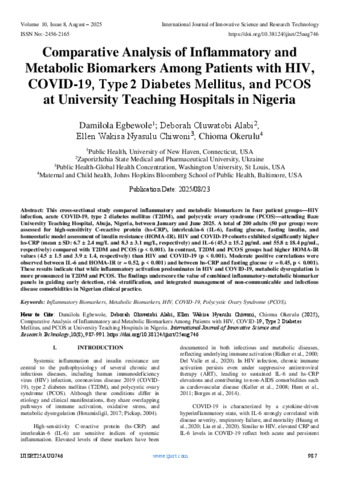 Egbewole, Damilola and Oluwatobi Alabi, Deborah and Nyasulu Chiwoni, Ellen Wakisa and Okerulu, Chioma (2025) Comparative Analysis of Inflammatory and Metabolic Biomarkers Among Patients with HIV, COVID-19, Type 2 Diabetes Mellitus, and PCOS at University Teaching Hospitals in Nigeria. International Journal of Innovative Science and Research Technology, 10 (8): 25aug746. pp. 987-991. ISSN 2456-2165