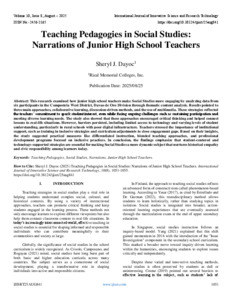 J. Dayoc, Sheryl (2025) Teaching Pedagogies in Social Studies: Narrations of Junior High School Teachers. International Journal of Innovative Science and Research Technology, 10 (8): 25aug841. pp. 1051-1055. ISSN 2456-2165