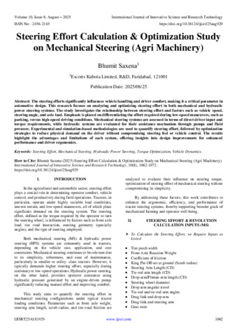 Saxena, Bhumit (2025) Steering Effort Calculation & Optimization Study on Mechanical Steering (Agri Machinery). International Journal of Innovative Science and Research Technology, 10 (8): 25aug929. pp. 1062-1072. ISSN 2456-2165