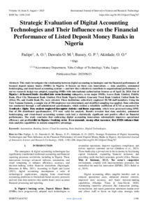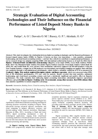 A. O., Fadipe, and O. M., Dawodu and G. P., Bassey, and O. O., Akinlade, (2025) Strategic Evaluation of Digital Accounting Technologies and Their Influence on the Financial Performance of Listed Deposit Money Banks in Nigeria. International Journal of Innovative Science and Research Technology, 10 (8): 25aug767. pp. 1196-1206. ISSN 2456-2165