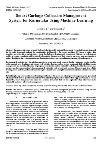 T., Srushti and ., Swarnalatha (2025) Smart Garbage Collection Management System for Karnataka Using Machine Learning. International Journal of Innovative Science and Research Technology, 10 (8): 25aug928. pp. 1211-1213. ISSN 2456-2165