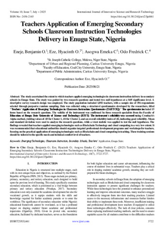 O., Eneje, Benjamin and O., Eze, Hyacinth and C, Asogwa Emeka and C., Odo Fredrick (2025) Teachers Application of Emerging Secondary Schools Classroom Instruction Technologies Delivery in Enugu State, Nigeria. International Journal of Innovative Science and Research Technology, 10 (7): 25jul661. pp. 3722-3727. ISSN 2456-2165