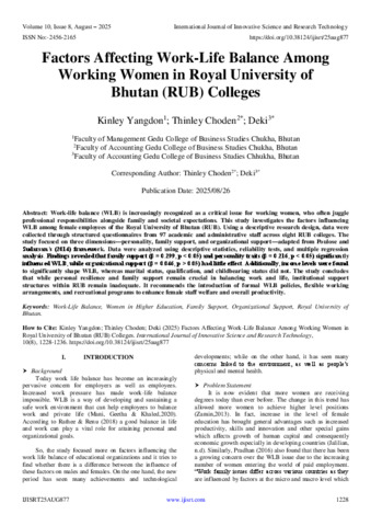Yangdon, Kinley and Choden, Thinley and ., Deki (2025) Factors Affecting Work-Life Balance Among Working Women in Royal University of Bhutan (RUB) Colleges. International Journal of Innovative Science and Research Technology, 10 (8): 25aug877. pp. 1228-1236. ISSN 2456-2165