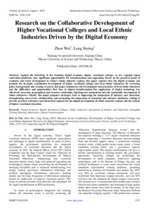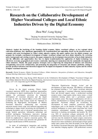Wei, Zhou and Siying, Leng (2025) Research on the Collaborative Development of Higher Vocational Colleges and Local Ethnic Industries Driven by the Digital Economy. International Journal of Innovative Science and Research Technology, 10 (8): 25aug205. pp. 1237-1243. ISSN 2456-2165