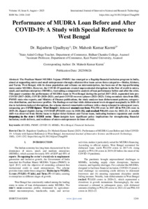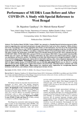 Upadhyay, Rajashree and Kumar Kurmi, Mahesh (2025) Performance of MUDRA Loan Before and After COVID-19: A Study with Special Reference to West Bengal. International Journal of Innovative Science and Research Technology, 10 (8): 25aug850. pp. 1244-1252. ISSN 2456-2165