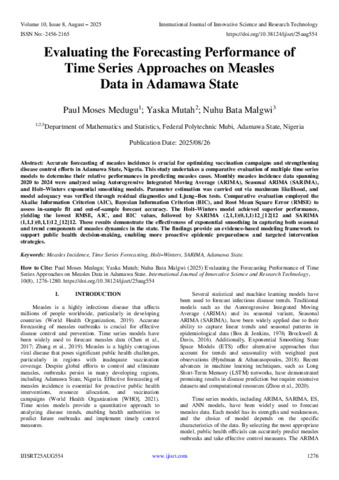 Medugu, Paul Moses and Mutah, Yaska and Malgwi, Nuhu Bata (2025) Evaluating the Forecasting Performance of Time Series Approaches on Measles Data in Adamawa State. International Journal of Innovative Science and Research Technology, 10 (8): 25aug554. pp. 1276-1280. ISSN 2456-2165