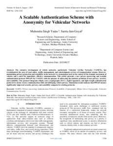 Singh Yadav, Mahendra and Jain Goyal, Samta (2025) A Scalable Authentication Scheme with Anonymity for Vehicular Networks. International Journal of Innovative Science and Research Technology, 10 (8): 25aug1022. pp. 1326-1331. ISSN 2456-2165